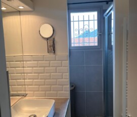 Ontspan en verfris uzelf in onze complete badkamer, voorzien van alle gemakken. Hier vindt u een comfortabele WC, een verfrissende douche en een handige wastafel, alles binnen handbereik voor uw comfort en gemak tijdens uw verblijf.